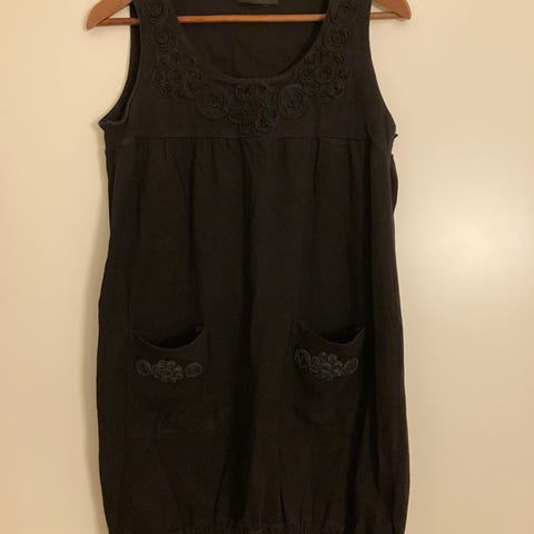 Zara hverdagskjole i sort bomuld til dame. Kjolen er i størrelse 36 og er uden ærmer. Den har lynlås foran og let rynkedetalje ved skulderpartiet. Fremstillet i bomuld, som giver et let og behageligt materiale egnet til hverdagsbrug. Enkel model, der kan bruges alene eller med lag under eller over afhængigt af sæson.