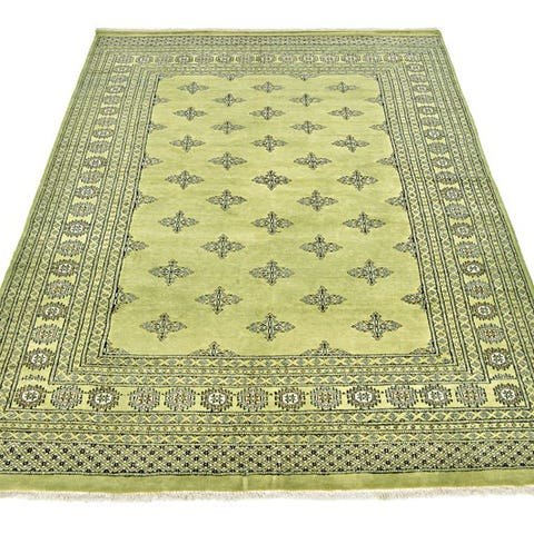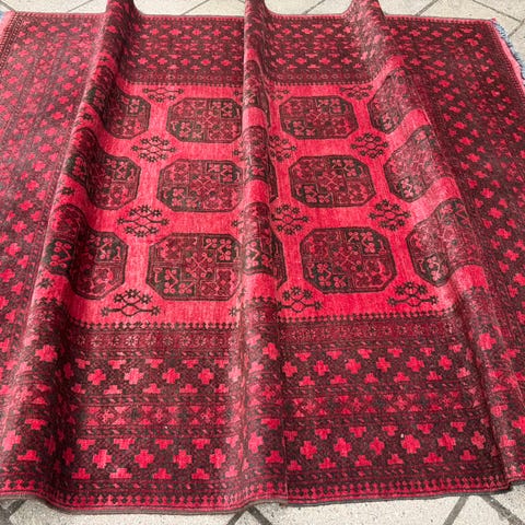Håndknyttet Bokhara-tæppe, der ofte er fremstillet i Pakistan med inspiration fra traditionelle turkmenske mønstre.