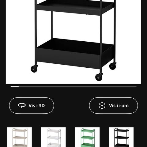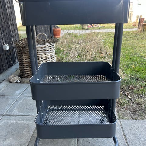 IKEA rullebord med 3 hylder i sort metal. Bordet har to åbne hylder og en nederste hylde med højere kant. Midterste hylde har mærke efter en skål. Bordet er på hjul.