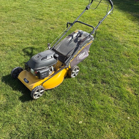 Texas T27 plæneklipper til benzin. Plæneklipperen har Sideudkast ses på venstre side. Håndtaget har betjeningsgreb. Starter første gang man trækker i snoren,Egnet til klipning af græsplæner i have og lignende udendørsarealer.
