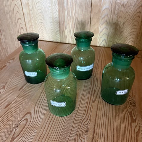 Apotekerglas fra 1970'erne i brunt glas med låg. Krukken har cylindrisk form med rund åbning og kraftig kant. Låget er kuppelformet og matcher glasset i farve. Velegnet til opbevaring af tørvarer, småting eller som dekorativ glasbeholder i køkken, stue eller badeværelse.