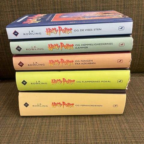 "Harry Potter og De Vises Sten", "Harry Potter og Hemmelighedernes Kammer", "Harry Potter og Fangen fra Azkaban", "Harry Potter og Flammernes Pokal" og "Harry Potter og Fønixordenen".