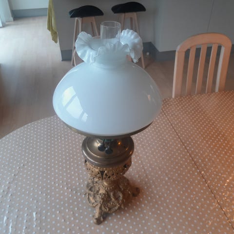 Olie- eller petroleumslampe glas og metal med dekoreret kuppel