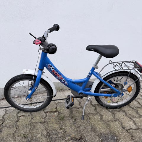 Puky børnecykel med 16" hjul i blå farve. Cyklen har lav indstigning, bagagebærer, skærme for og bag. Egnet som børnecykel til mindre børn, der er klar til at cykle uden støttehjul. Produceret i Tyskland.