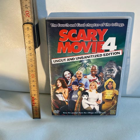 Scary Movie dvd. Filmen er en komedie/parodi med gysertema, udgivet på dvd-format. Disken leveres i standard plastcover, som vist på billederne. Yderligere specifikationer som sprog, undertekster og spilletid fremgår af selve dvd’en og coveret.