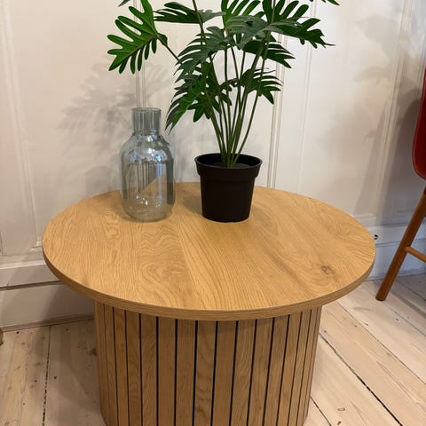 Rundt sofabord med løs bordplade i trælook og sort metalstel i tråddesign. Bordpladen kan løftes af, så den underliggende kurv kan bruges til opbevaring. Egnet som sofabord eller sidebord i stue eller opholdsrum.