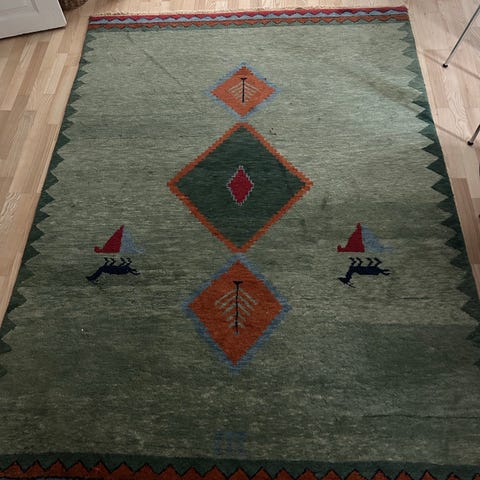 Smukt håndknyttet tæppe fra Iran. Et aflangt tæppe med målene 2,5 ×3,5. Smukt mønster med frynser. Kommer fra ikke rygerhjem.