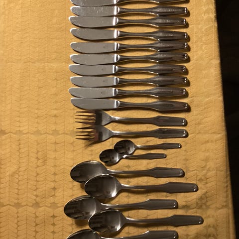 Raadvad, Orla Vagn Mogensen. Bestiksæt til 12 personer, 60 dele. Elegant og klassisk dansk design fra Raadvad, tegnet af Orla Vagn Mogensen. Sættet består af 12 knive, 12 gafler, 12 spiseskeer, 12 suppeskeer og 12 teskeer. Alt er udført i plet sølv.