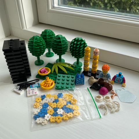 LEGO plante- og trædele blandet lot. Sættet omfatter forskellige grønne elementer som træer, blade, grene og buske samt små blomster i flere farver. Delene kan bruges til at bygge landskaber, haver, skove og andre naturmiljøer i LEGO-kreationer. Alle dele er originale LEGO-klodser i plast.