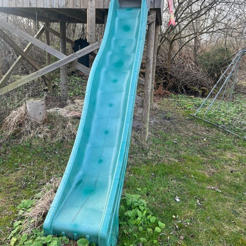 Blå rutsjebane i plast til udendørs brug. Rutsjebanen har bølget form og er beregnet til montering på legetårn eller lignende legepladsudstyr. Velegnet til børn og kan fastgøres i toppen via forborede huller. Plastmaterialet gør rutsjebanen let at rengøre og modstandsdygtig over for vejr og vind.