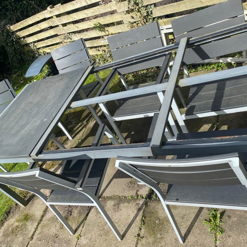Havebord med 6 matchende stole. Bordet har rektangulær bordplade i mørkt materiale og ben i lyst metal. Stolene har stel i metal med buede armlæn og sæde/ryg i sort plast. Sættet er egnet til udendørs brug på terrasse, altan eller i have og giver siddepladser til seks personer omkring bordet.