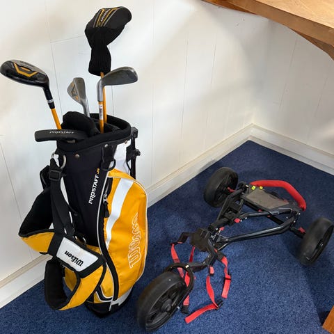 Wilson Staff golfkøllesæt med bag. Sættet består af flere jern og køller samt en golfbag med flere lommer til opbevaring af bolde og tilbehør. Velegnet til nye golfspillere, der ønsker et komplet sæt med bag til brug på banen.