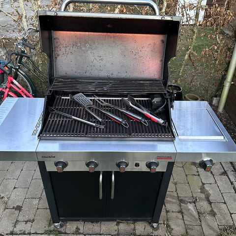 Char‑Broil Professional gasgrill 5 år gammel med 4 brændere og 1 sidebrænder, alt virker. Grillen har låg med indbygget termometer, stor grillrist i støbejern samt varmholdningsrist i stål. Arbejdsflader i rustfrit stål på begge sider giver plads til forberedelse af mad. Under grillen er der skab med dobbeltlåger til opbevaring af gasflaske og grilltilbehør. Grillen er udstyret med hjul. Overtræk medfølger.