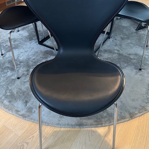 6 stk forsidepolstret med sort læder og sort ask træ. Alle stole er brugt meget lidt og fremstår nærmest som nye.