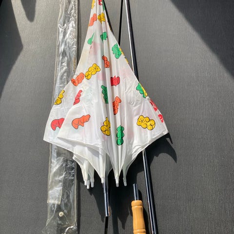 Børneparaply i gennemsigtig plast med farverigt mønster. Paraplyen har kuppelformet skærm, der går godt ned omkring barnet, samt håndtag og kanter i en kontrastfarve. Egnet til brug af børn på regnvejrsdage, hvor der ønskes god dækning og udsyn gennem skærmen.