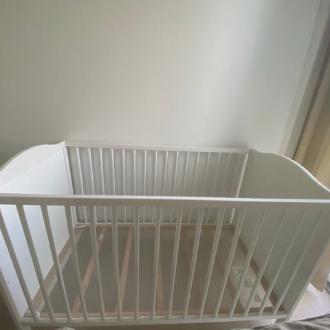 IKEA tremmeseng i hvidt design og med madras. Sengen har tremmesider hele vejen rundt og vi har selv udstyret med hjul, så den er let at flytte efter behov. Klassisk rektangulær form 120x60 i madrasmål.