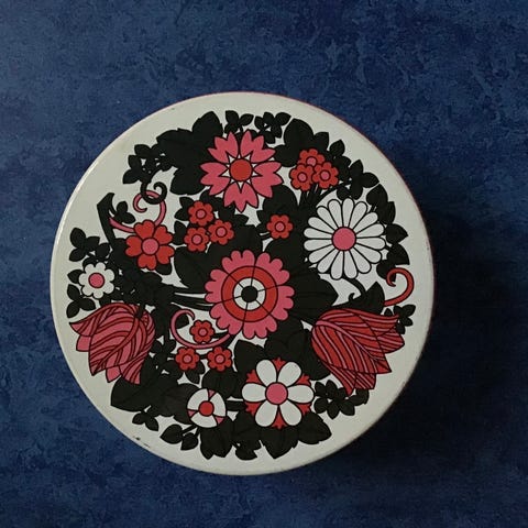 Vintage rund kagedåse med eventyrmotiv. Dåsen er udført i metal med farverigt tryk på låg og sider. Låget viser en illustreret scene med personer og en elefant, mens siderne er dekoreret med forskellige dyremotiver på rød baggrund. Egnet til opbevaring af småting, kager eller som dekoration. Fra 1960