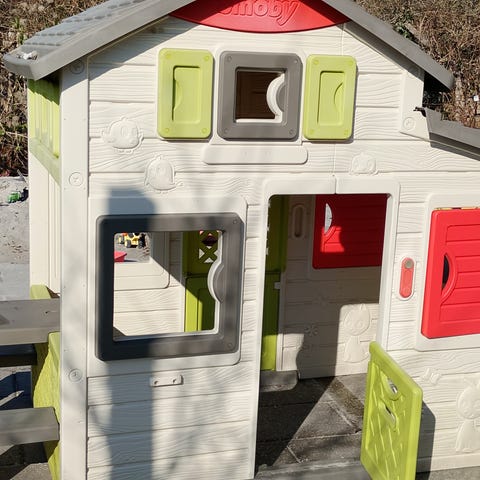 Legehus fra Smoby. Nypris ca 1800 har været brugt i 4 år med stor glæde af to børn. Er ikke nyvasket, men det er nemt at spule ned med haveslangen 😊 vejer ikke ret meget og kan nemt løftes op på en trailer.