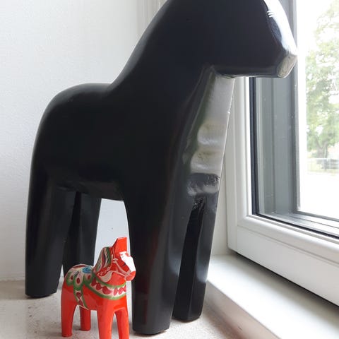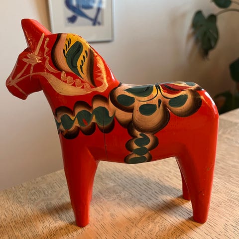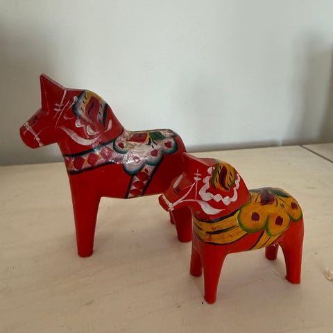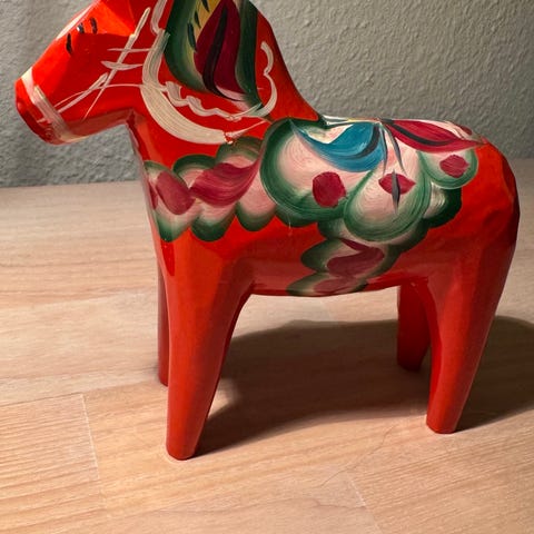 Vintage, Nils Olsson dalar-hest træfigur i Rød/ Orange med håndmalet dekoration i flere farver. Figuren er udført i træ og har klassisk svensk dala-hest design med ornamentik på siderne. Egnet som pynt eller samlerobjekt i hjemmet. Mærkat under bunden angiver producenten Nils Olsson, Nusnäs, Sverige. Meget fin stand.