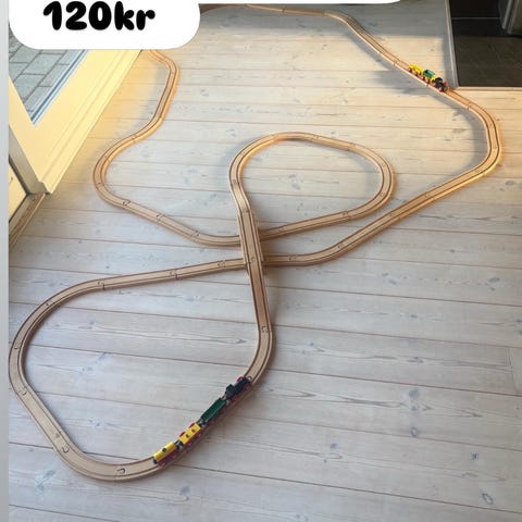 BRIO togbane træsæt med skinner og tog. Sættet består af forskellige lige og buede træs kinner, skiftespor, brodele og en drejeskive i træ. Der medfølger flere små trætog og vogne i forskellige farver. Delene er kompatible med BRIOs klassiske trætogsystem og kan bruges til at bygge forskellige sporopsætninger til leg med togbane.