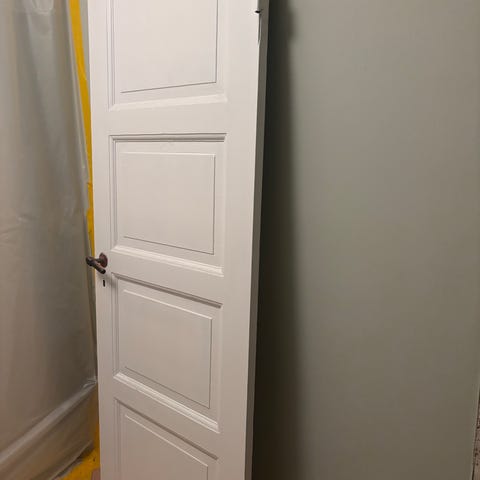 Indvendig fyldningsdør i hvidmalet udførelse. Døren har klassisk fyldningsdesign med flere rektangulære felter og er monteret i karm.