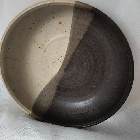 Keramik skål med hanke i hvid og brun glasur. Skålen er rund med to små sidehanke og dekoreret med brune striber på ydersiden samt brunt mønster i bunden indvendigt. Velegnet som serveringsskål eller til brug i køkkenet. Materialet er glaseret keramik/stenware, og overfladen fremstår med et rustikt udtryk.
