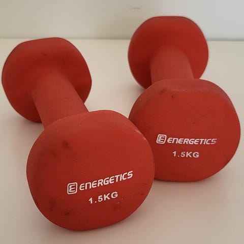 Energetics håndvægtsæt bestående af en håndvægtstang med lukkemøtrik og flere runde vægtskiver. Sættet leveres i en hård plastkuffert med bærehåndtag, som gør det nemt at opbevare og transportere. Vægtskiverne er af metal og kan kombineres efter behov for at justere belastningen til forskellige styrketræningsøvelser til overkrop og arme.