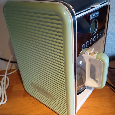 Ariete Vintage kaffemaskine i lyseblå med glaskande. Frontpanel med knapper og display til betjening. Maskinen har sidepaneler med rillet vintage-design og aftagelig glaskande med håndtag i matchende farve.