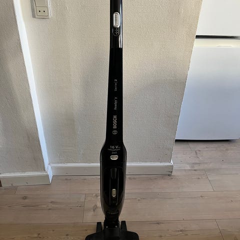 Bosch Readyy’y Serie 2 2-i-1 ledningsfri støvsuger i sort. Modellen har indbygget håndstøvsuger, der kan tages af til mindre rengøringsopgaver. Støvsugeren drives af et 20V batteri og står i en ladestation, som medfølger. På skaftet sidder en betjeningsknap til regulering af sugestyrke. Egnet til almindelig rengøring af gulve og andre overflader i hjemmet.
