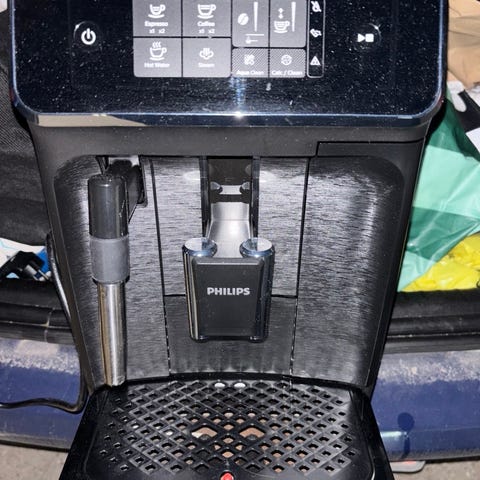 Philips espressomaskine i sort med integreret mælkeskummer. Maskinen har frontbetjent betjeningspanel med touchknapper til valg af forskellige kaffedrikke. Aftagelig drypbakke og rist samt aftagelige dele for nem rengøring. Vandbeholderen er placeret på siden af maskinen. Egnet til brygning af espresso og andre kaffedrikke baseret på hele bønner eller formalet kaffe, afhængigt af model og indstillinger. Velegnet til brug i køkkenet til daglig kaffebrygning.