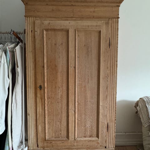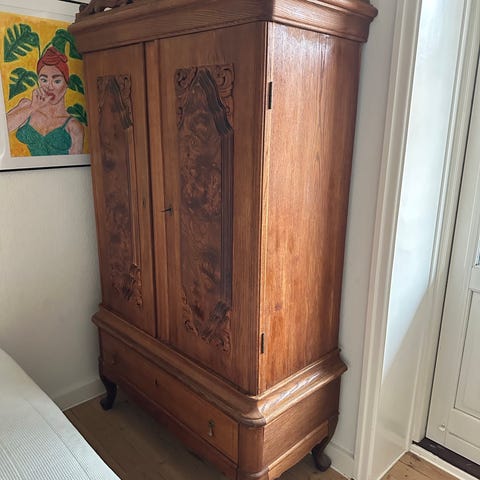 Gammel karlekammerskab. Lågen er lidt skæv, så skal skubbes for at lukke helt.