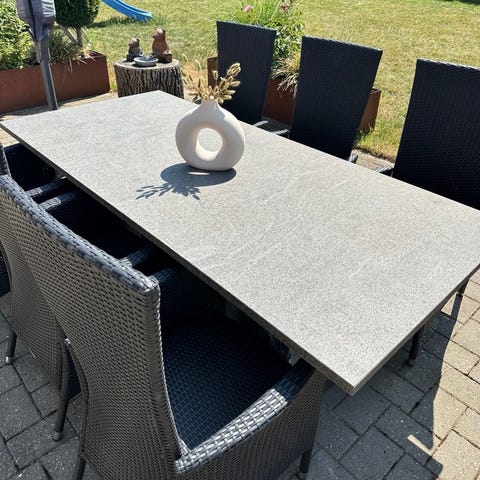 Granit havebord, grå. Mål 100x220 cm. Bordet står på 2 granit sokler (det er tungt).
