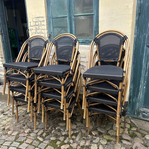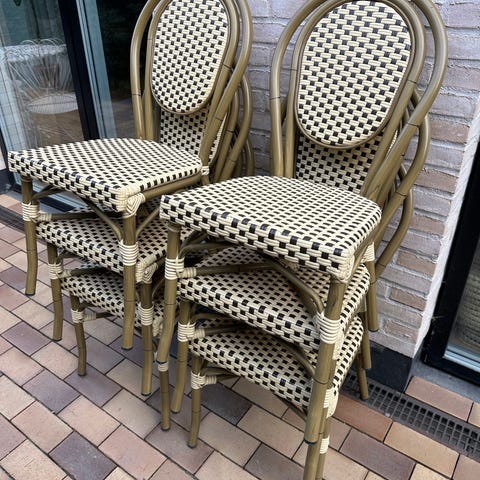 Franske cafe stole i blå og hvid polyrattan