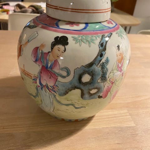 Kinesisk krukke med låg, Kinesisk krukke med låg Højde ca. 30 cm - Bredde, hvor den er bredest ca. 20 cm.