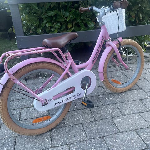 Børnecykel med 18" hjul i grøn farve. Cyklen har lav indstigning, bagagebærer og kurv foran. Velegnet til børn, der er vokset ud af mindre børnecykler og har brug for en cykel i mellemstørrelse til hverdag og fritidskørsel.