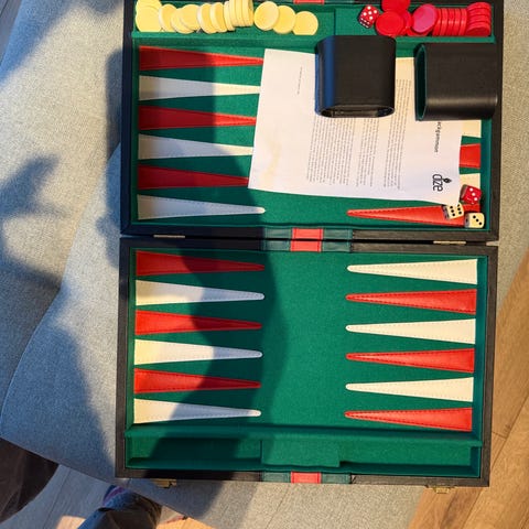 Backgammon spil i kuffert med grøn spilleflade og grå yderside. Spillet leveres i en transportabel kuffert med håndtag og metallåse. Indvendigt er der klassisk backgammonbræt med felter i grøn, hvid og mørk farve. Sættet indeholder brikker i to farver, terninger samt raflebægre. Velegnet som rejseudgave eller til opbevaring, når spillet ikke er i brug.