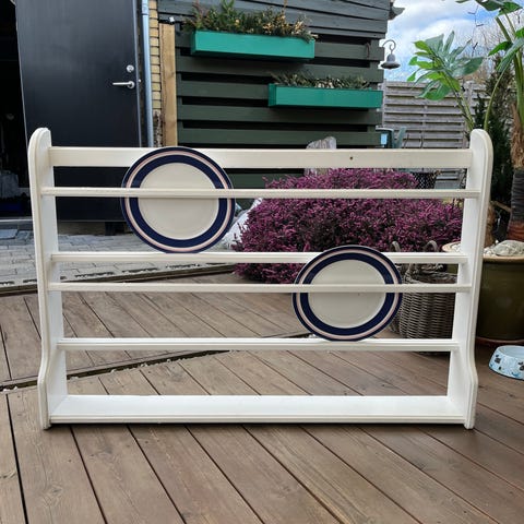 Ældre tallerkenrække i træ med forskellige lag af maling. Trænger til en kærlig hånd, men er solid. Kom gerne med et bud.