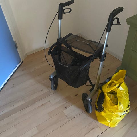 Rollator med fire hjul, håndbremser og stel i metal. Modellen har trådkurv under sædet samt aftagelig bakke øverst. Egnet som ganghjælpemiddel til voksne, både indendørs og udendørs, hvor der er behov for støtte under gang og mulighed for at transportere mindre genstande i kurven eller på bakken.