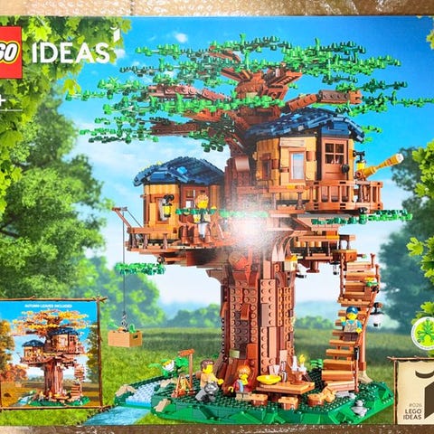 Ideas træhus byggesæt. Sættet forestiller et detaljeret træhus med flere små huse bygget op omkring en stor træstamme. Modellen indeholder forskellige rum med indretning som seng, borde, stole og tilbehør samt udvendige detaljer som stige, terrasse og gynge. Byggesættet er egnet til opbygning og leg samt som udstillingsmodel for LEGO-samlere.