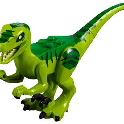 LEGO Dilophosaurus (version 2 med flexibel hale) i grønne og orange nuancer, og med bevægelige ben, arme, hale og kæber.