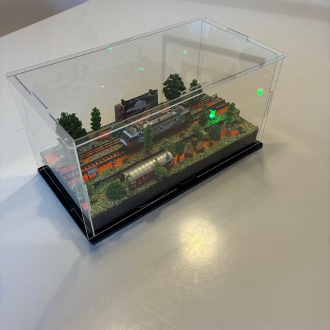 Märklin Z skala 1-220 Modeltog diorama i glasmonter. Dioramaet viser et lille jernbanemiljø med tog, skinner, bro tog overgang træer og landskab med en flod Det hele er monteret på en sort bundplade og beskyttet af en gennemsigtig plast- eller glasboks. Egnet som udstillingsmodel til samling eller dekoration.