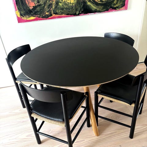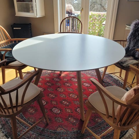 Bordet er i rigtig god stand med enkelte ridser i bordpladen, som dog blender ind i træets struktur/mønster, og som derfor kamuflerer det meget.