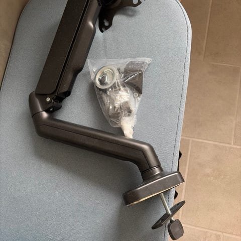 Skærmarm til skrivebord i sort metal. Armen er justerbar og består af flere led, så skærmens position kan ændres i højde og vinkel. Monteres på bordkant med medfølgende bordklemme og skruer. VESA-beslag til montering af skærm følger med, sammen med diverse monteringsdele. Velegnet til brug med en computerskærm på et skrivebord, hvor der ønskes fleksibel placering af skærmen. Det virker meget fint. Jeg har bare skriftet til en anden løsning og har ikke brug for den længere.