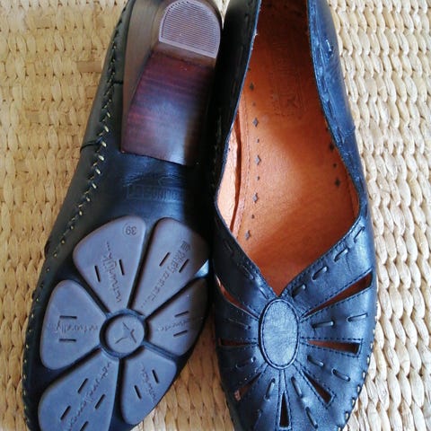 Pikolinos ballerina sko i str. 40. Skoene er i beige læder med udskårne blomsterdetaljer og synlige stikninger langs kanten. Modellen har rem over vristen og flad sål, velegnet som damesko til hverdagsbrug.