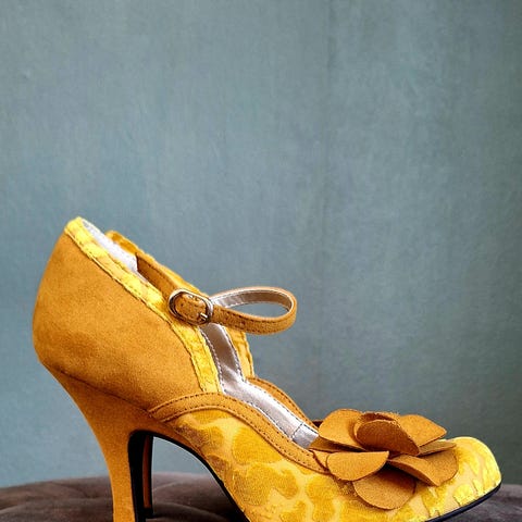 Smuk grøn højhælede sko, med blomsterdetaljer på siden og blomst på tå.
