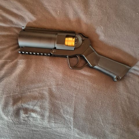 Den har nogle skønheds fejl har og der...... Den mangler en skruge, som set på billedet,granat løbet skal lige smøres lidt, da den godt kan finde på at sidde fast efter skud