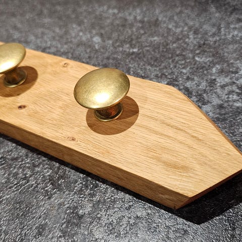 Knagerække i træ med tre runde, sorte knager. Selve listen er udført i egetræ med skrå afskåret ende. Velegnet til ophæng af jakker, håndklæder eller tilbehør i entré, køkken eller badeværelse. Monteres på væg