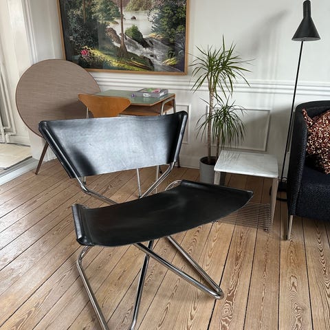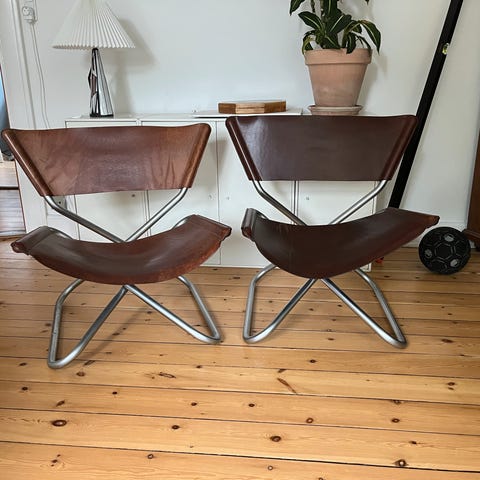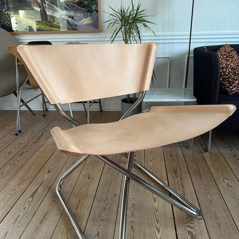 Erik Magnussens første møbelopgave fra 1968. Enkel og let konstruktion i stål med sæde og ryg i meget lækkert kernelæder. Stolen kan foldes. Den kombinerer funktion, design og komfort i et enkelt og let udtryk.
