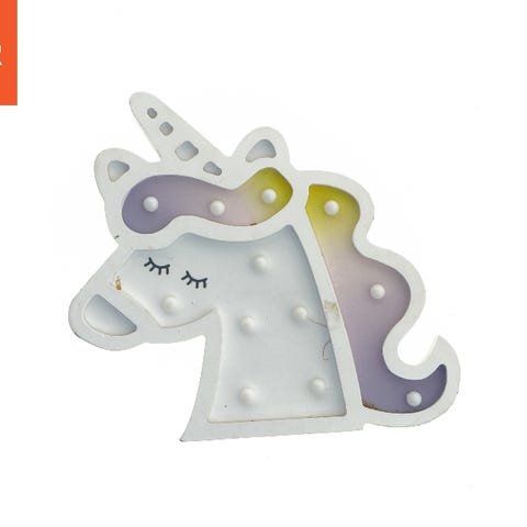 En lille LED bordlampe, formet som en enhjørning med vinger. Lampen består af en base med krakeleret tekstur og transparent akrylfigur, der lyser op når den er tændt. Den leveres med en strømadapter og ledning til tilslutning. Størrelsen er H. 15 cm. Tags: LED, enhjørning, bordlampe, belysning.