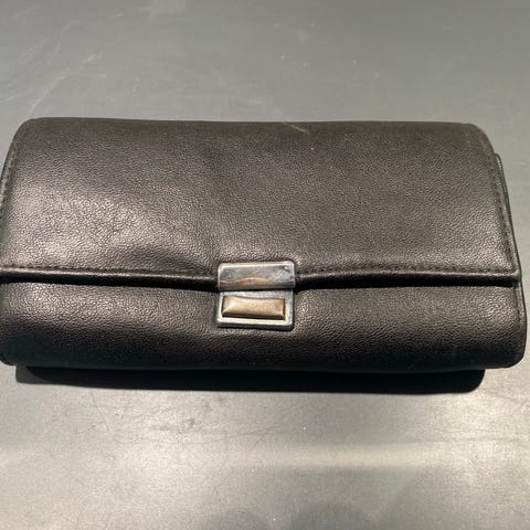 En foldbar sort læderpung med flere kortrum og et rum til mønter. Pungen har synlige tegn på brug, herunder ridser og en patina på det brune læder indvendigt. Detaljer indikerer, at den er fremstillet af Greenwhich Læder, Italien.